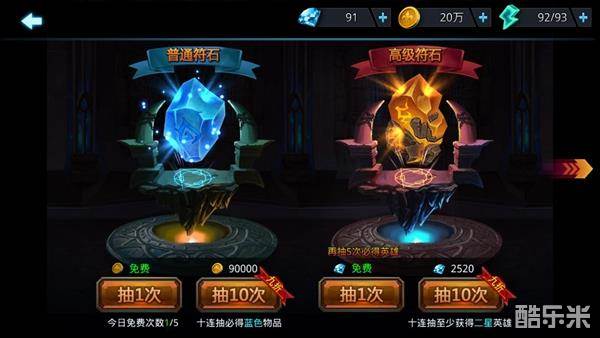很多途径可获取金币,游戏中的金币产量还是挺高的,金币也可以用来进行宝箱抽取。如若你有多余金币不妨开起几次普通符石。初期只有2个英雄的情况下,可通过开金币符石获得第三个英雄,在前期帮助还是相当之大的不容小窥(建议金币10连抽)。