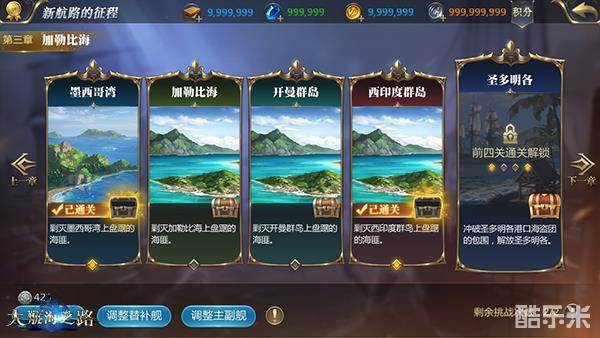 作为一类游戏中全新加入的单人PVE挑战玩法,全新开启的“新航路的征程”一共有9个章节,每个章节都由4个普通关卡和1个boss关卡构成,成功完成每个关卡,船长都将有机会开启任务宝箱,获得丰厚过关奖励。船长可结合自己的策略安排,随意选择普通关卡的挑战顺序,完成每章四大普通关卡之后,方可挑战每章终极boss,有机会赢取更加丰厚奖励!