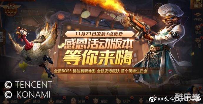 感恩节的专属BOSS出现了,火鸡终结者——相互配合利用场地的南瓜加农炮,可以给狼人大厨造成可观的伤害;被大厨烧熟的火鸡会变成火鸡大餐,吃完可以暂时提高魂斗罗战士的能力!