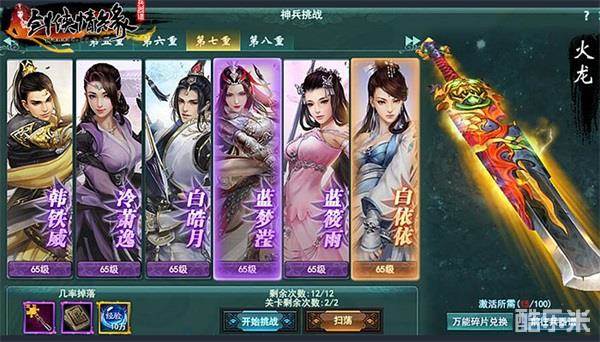珍稀兵器碎片 多种途径持续获取 《剑侠情缘兵器谱》每种兵器的获取途径都不一样,玩家可通过挑战神兵副本、首充礼包、每日首充、VIP等级礼包、运营活动、商店兑换等方式获得兵器。在神兵挑战系统中,玩家等级越高可挑战的副本越多,挑战成功可获得的兵器种类也就越多,还有机会获得“万能碎片”。在神兵挑战界面点击万能碎片兑换,玩家可通过消耗万能碎片兑换多种兵器。