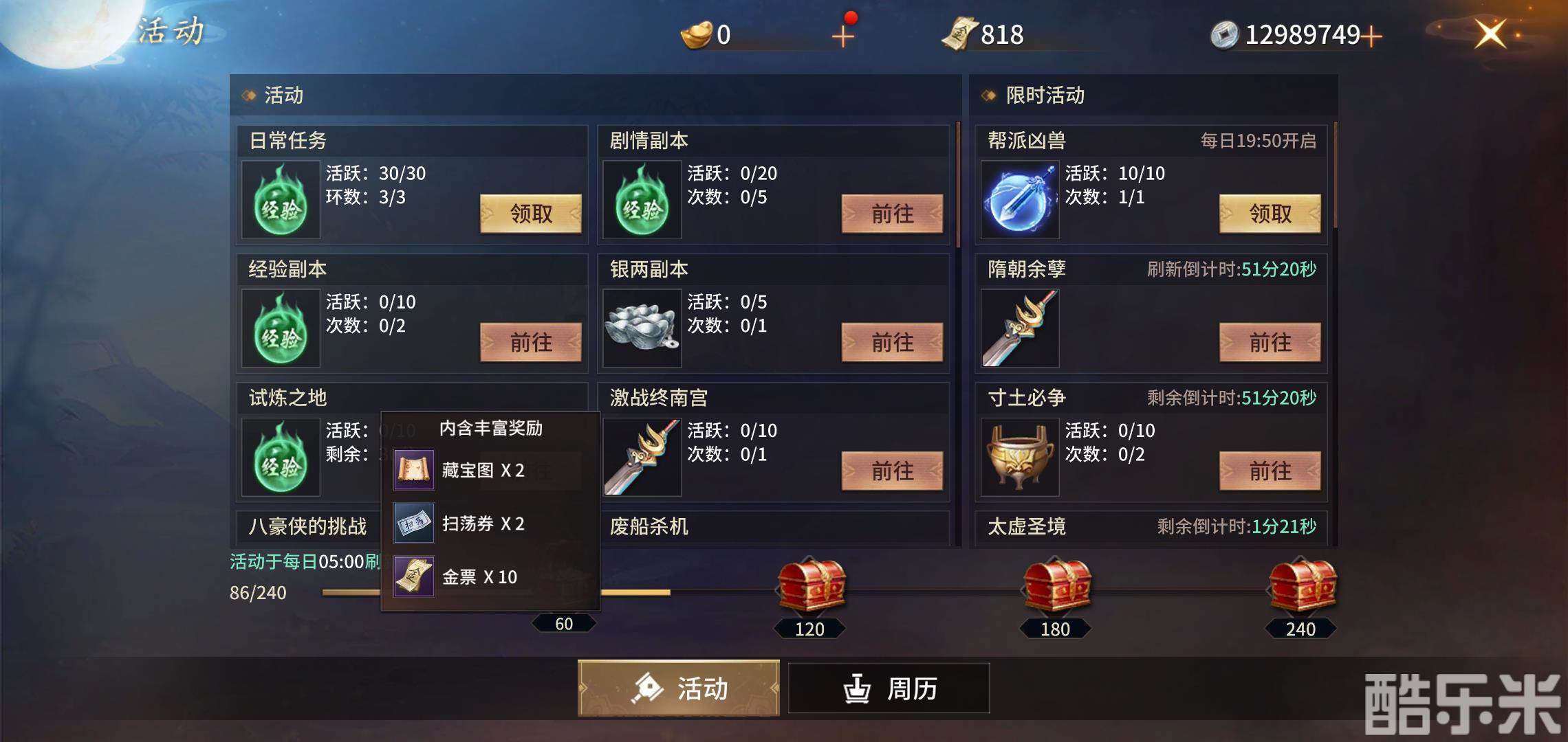 目前在游戏中只有一个获得藏宝图的方式,就是每天活动中的活跃度奖励,每个活跃度的档次都会获得2个藏宝图,在完成任务参与活动的同时还能获得藏宝图,岂不美哉。