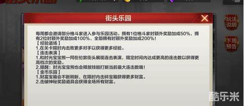 每周都会邀请部分格斗家进入参与乐园活动。拥有1位格斗家时额外奖励加成50%,拥有2位时额外奖励加成100%,全部拥有时额外奖励加成200%