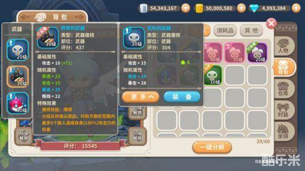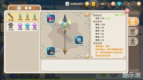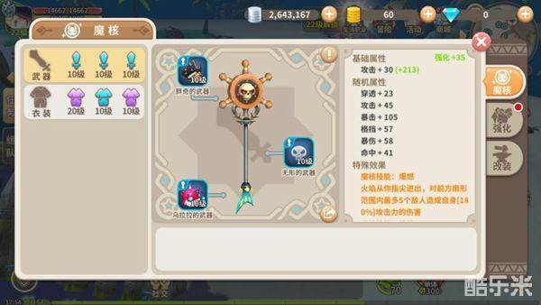 除了不同的魔核组合能够改变外形之外,同一个部位中不同魔核之间变换位置,还能够对该部位的外形进行细微的调整。例如,将“乌拉拉的武器”魔核和“胖奇的武器”魔核分别组装在武器的顶部和底部,武器就会呈现出顶部似鱼眼,底部有铜座的造型,反之,武器则会变成顶部是船舵,底部是鱼尾的造型。