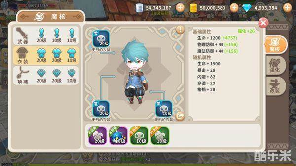 非常值得一提的是,在游戏中,每一种魔核都拥有独特的外观造型,当玩家将名字相同的一套魔核组装在一个部位上,该部位将会呈现出一整套风格相同的外形;而当玩家将名字不同的魔核同时组装到一个部位上,该部位的外形就会变得个性化。例如,在游戏中有一种名叫“无形的衣装”的魔核,三个一套装备在衣装部位时,角色的衣装外形是蓝色调的外衣,而如果将“无形的衣装”“植物的衣装”和“鱼咕咕的衣装”三种魔核同时装备在衣装上,衣装的外形就会有翻天覆地的变化。