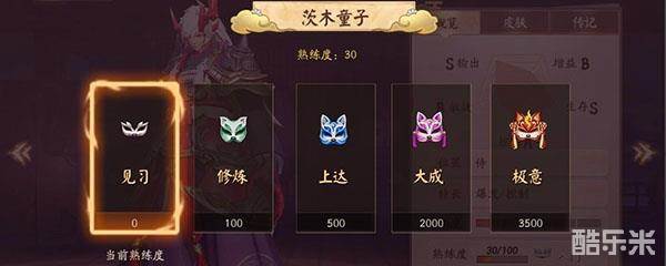 决战平安京里的英雄,熟练度可以通过对战来进行提升,熟练度有很多的等级,每次比赛结束都会有增加,这里会显示我们所在的等级,距离下一个熟练度需要的经验值。