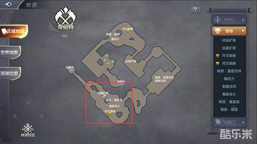 怪物分布:因为是矿物任务地图,所以这里的怪物并不是很多,普通怪物有3种:魔柱力、骷髅法师和魔晶战士;精英怪有2两种:精英·魔晶皇、精英·魔屠;BOSS领主是符文蜘蛛。
