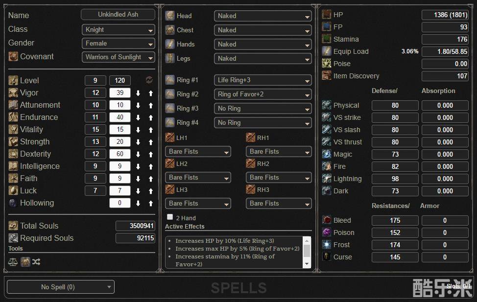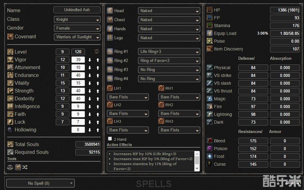 可以看到在生命戒指+3和宠爱戒指+2的支持下,这套加点保证了标准的血量(1800)和允许范围内最高的精力(176)。