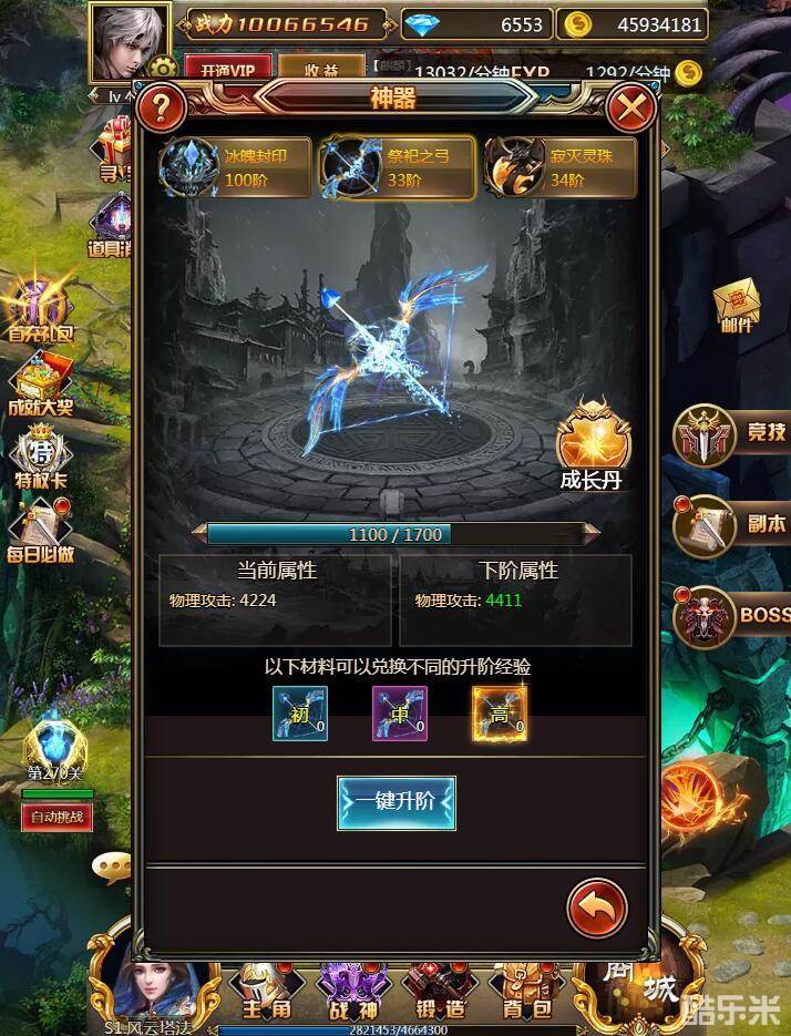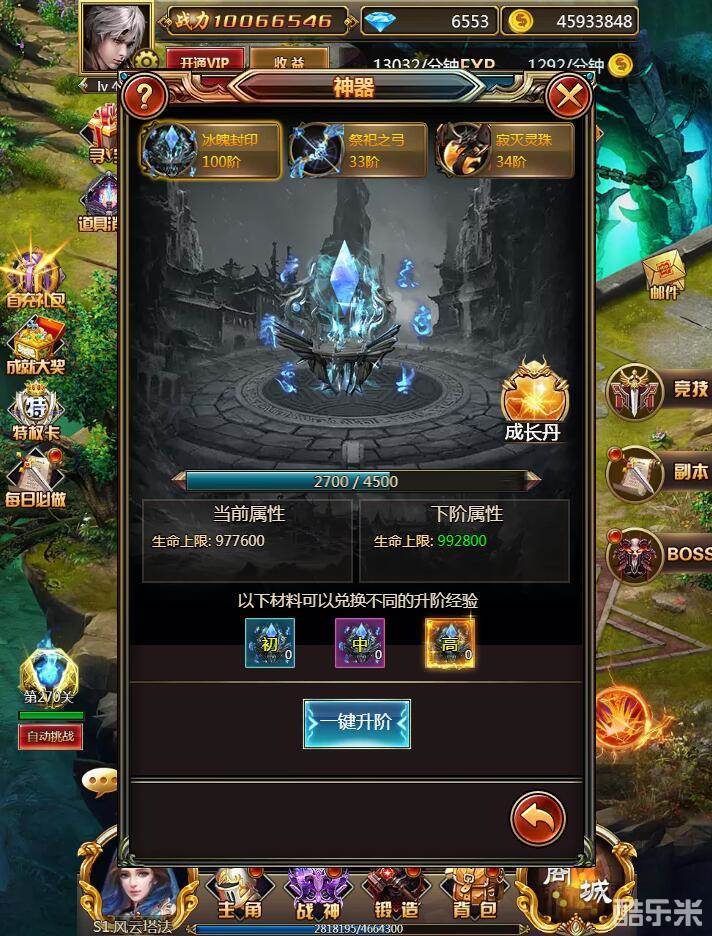 《诸神召唤H5》神器系统中一共有3大神器供玩家选择,冰魄封印、祭祀之弓、寂灭灵珠,会分别增加生命上限、物理攻击以及暴击等级三个重要属性,游戏中解锁神器非常简单,只需要按着任务提示一点一点完成就可以解锁神器,之后就能增加巨额战力。