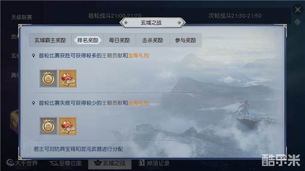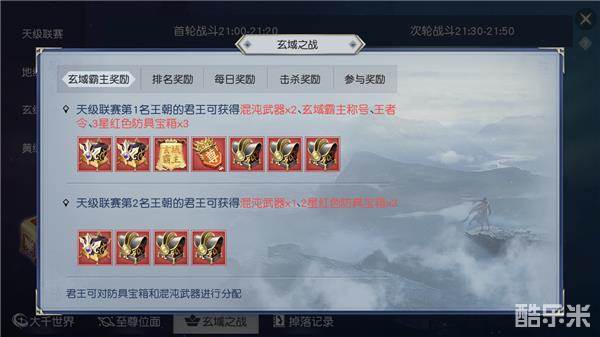 老规矩,开始前还是跟道友们简单的介绍一下规则及奖励。玄域之战,百朝大战2.0版,服务器世界等级达到391级才能开启,每周六晚准时开启,每周为一个赛季。比赛方式为联赛制,由低到高分别为:黄级联赛、玄级联赛、地级联赛、天级联赛,所处联赛级别越高,则奖励越好。