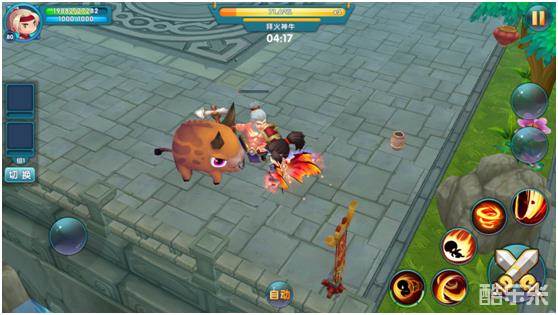 火蛮古地是第一章节最后一个奇遇副本,Boss为拜火神牛,虽然名字很霸气,但造型却是个萌物。可是别看长的萌,防御和伤害可不容小窥。先说下Boss的主要技能:1.普通攻击 2.自身范围为中心触发地震 3.先前冲刺。相对于前面2个副本,火蛮古地的Boss相对笨拙一些,伤害很容易躲避,但并不是你想的那么简单。