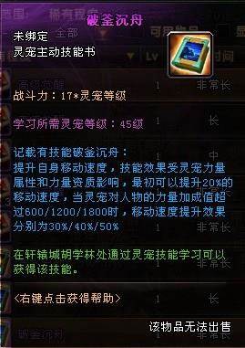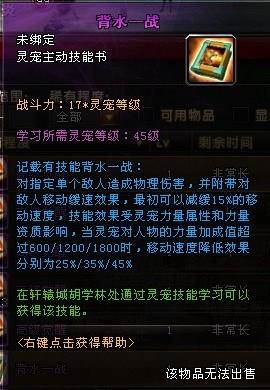 背水一战(对指定单个敌人造成物理伤害,并附带对敌人移动缓速效果,最初可以减缓15%的移动速度,技能效果受灵宠力量属性和力量资质影响,当灵宠对人物的力量加成值超过600/1200/1800时,移动速度降低效果分别为25%/35%/45%)