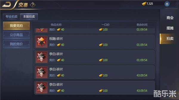 分为【帮会拍卖】【本服拍卖】使用【元宝】作为交易货币帮会活动产出的稀有道具将进入【帮会拍卖】,拍卖所得均分给参与活动的帮会成员【帮会拍卖】流拍道具进入【本服拍卖】,本服玩家所有玩家可以参与拍卖,拍卖所得均分给参与活动的帮会成员拍卖物品结束后价高者得,使用一口价可直接拍下物品;