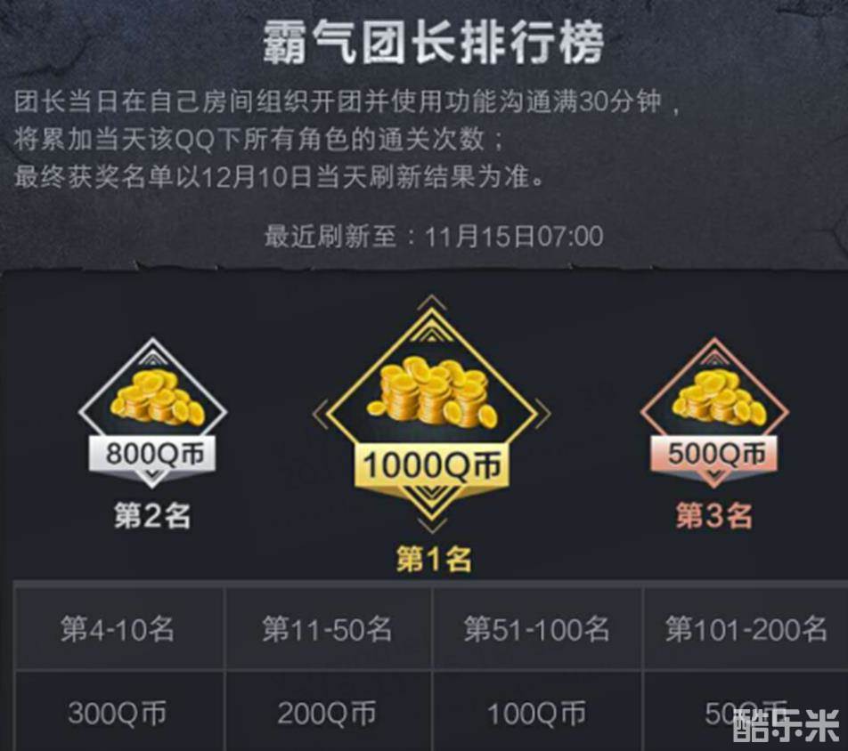 每天都要进入自己的团本房间并且在麦上组织打团满半小时,就可以统计当天的游戏副本通关次数,这个次数将进行排名,最终排名结果以12月10日刷新的结果为准,活动结束后根据排名发放Q币,最高可得1000Q币!