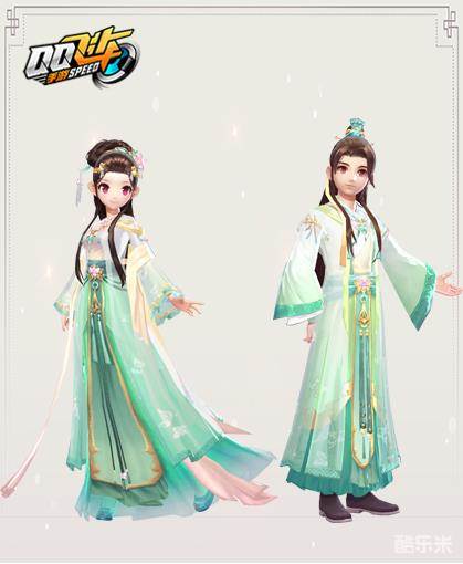 碧绿的颜色如同初春的新草,春意盎然中透露出一丝青涩的感觉,绫罗佳人套装将绿色的长裙与白色的轻纱结合在一起,华丽繁复的云纹使得整套衣裳看起来华贵高雅,而粉嫩的荷花配饰又流露出少女的天真烂漫。锦衣公子套装同样是碧青色的底色,配以清秀挺拔的竹子暗纹,象征着翩翩佳公子,具有竹子一般正直美好的品格。