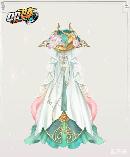 层层叠叠的轻纱上配以金色装饰,在行走间有耀眼的光芒闪动,白色的披风之下有粉色的飘带和绿色的下摆,仿佛是一支初露头角的荷花,在悄悄吐露芬芳之际点亮荷塘月色。披风肩部同样有荷叶与荷花的设计,配以鲤鱼饰品,可以说是诗意盎然,寓意吉祥。