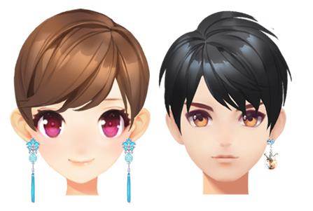 女生的耳饰是亮眼的蓝色,古香古色的云纹设计配以精致镂刻的香球,搭配长长的流苏坠饰,修饰出女生美丽的脸庞,如同仕女图中娴静优雅的古风美人。男生的耳饰以璀璨的钻石搭配王冠与水晶球,水晶球中是金色的光点上下涌动,仿佛是茫茫宇宙间不断变幻的星河,气势磅礴。