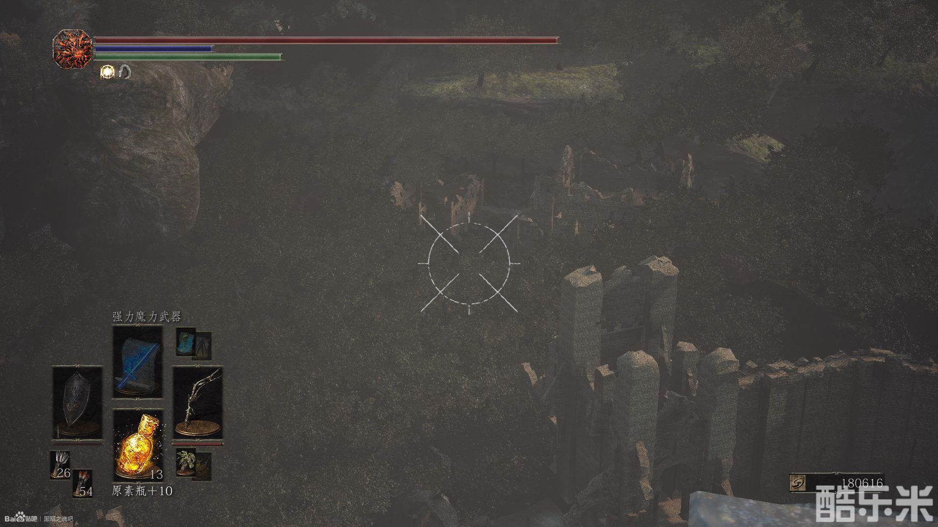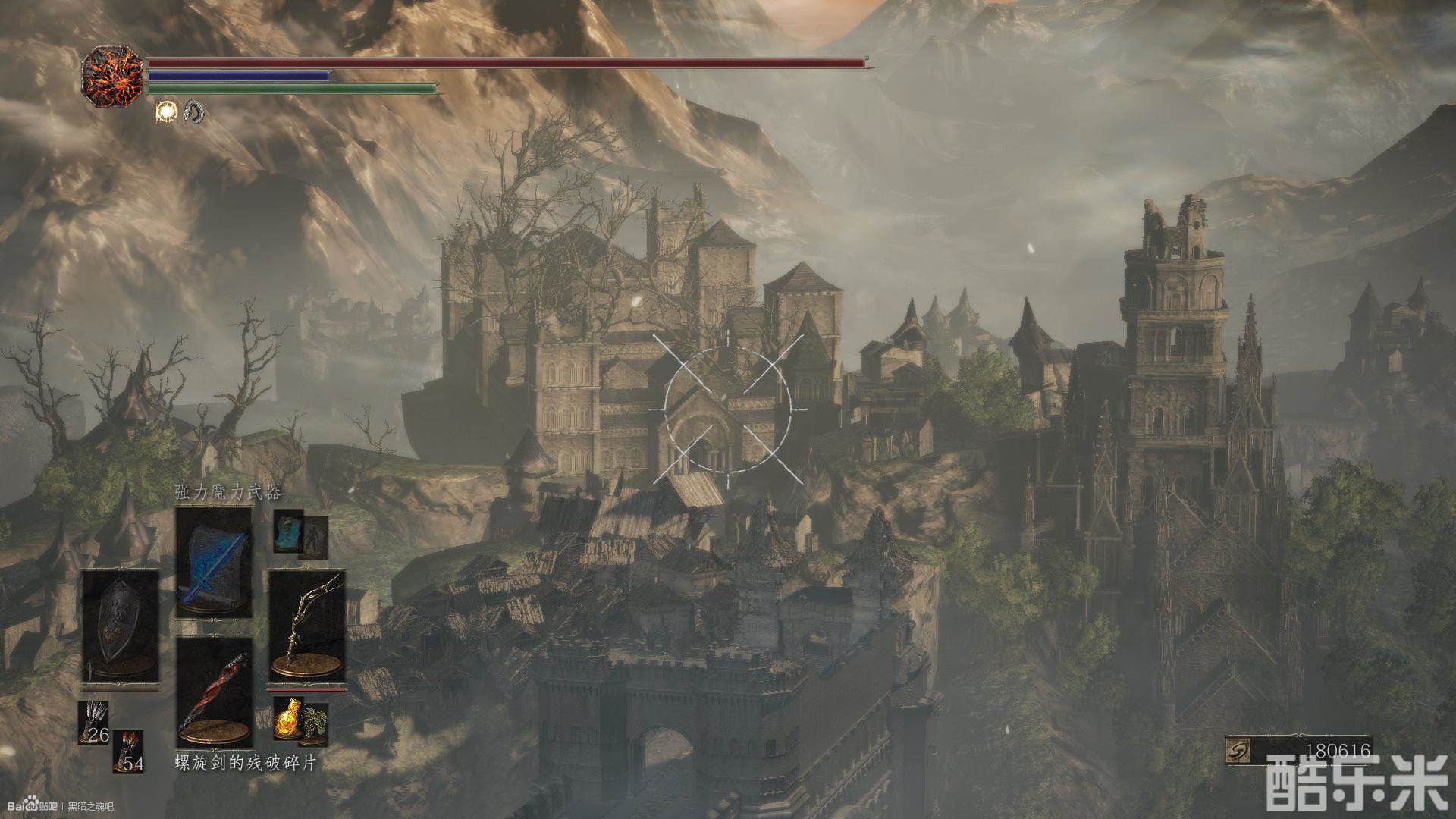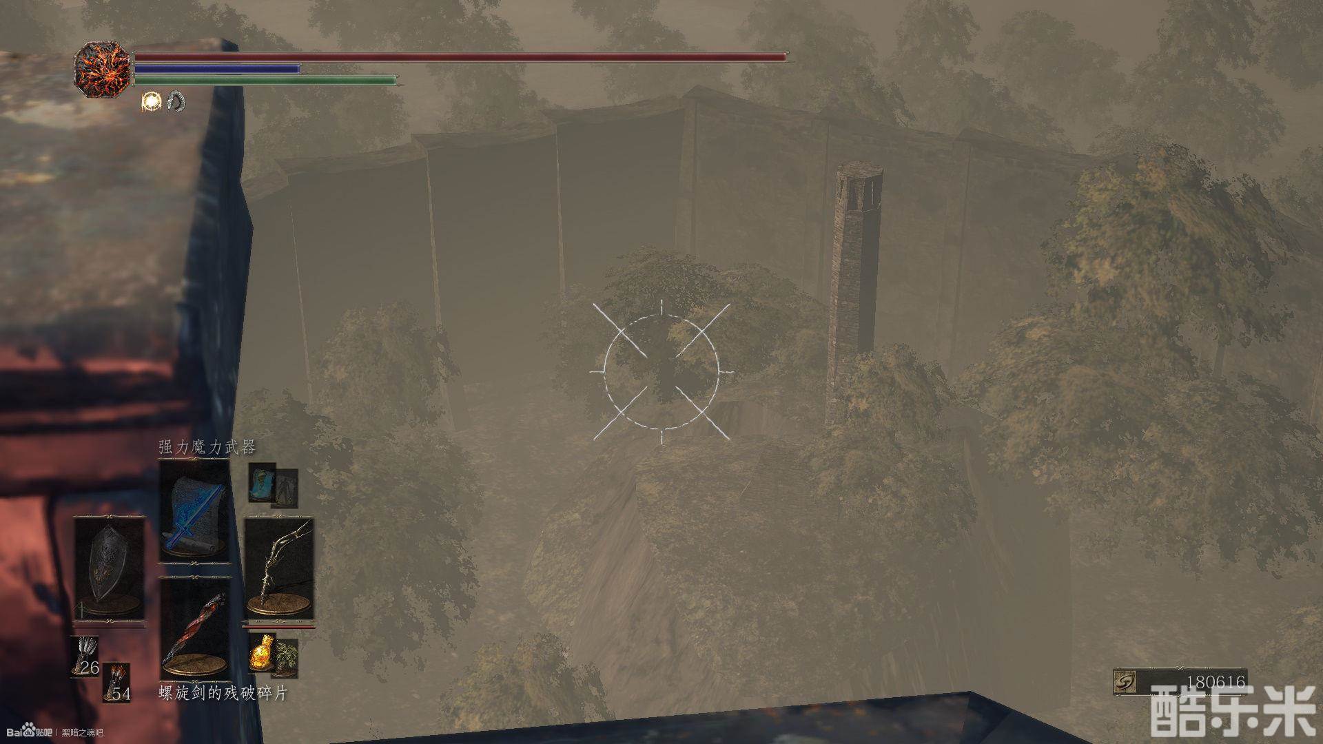 如图,当我们来到“高举小环旗”的这里,我们几乎是正对不死聚落和大树那里。而幽邃教堂在我们右侧,根据我之前说的面对南方,右侧就是西。而且,看起来似乎幽邃教堂距离我们比不死聚落还更近一点。