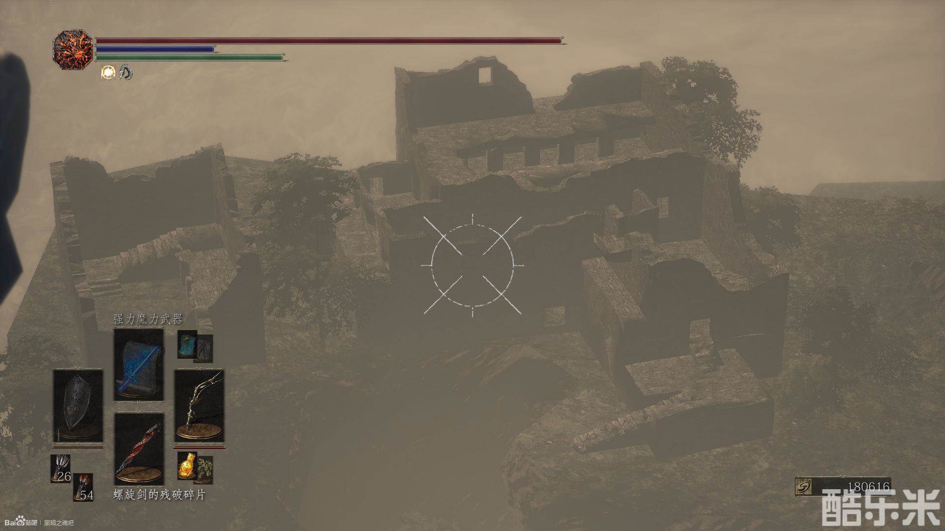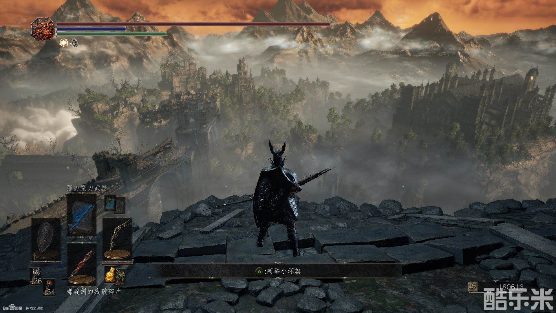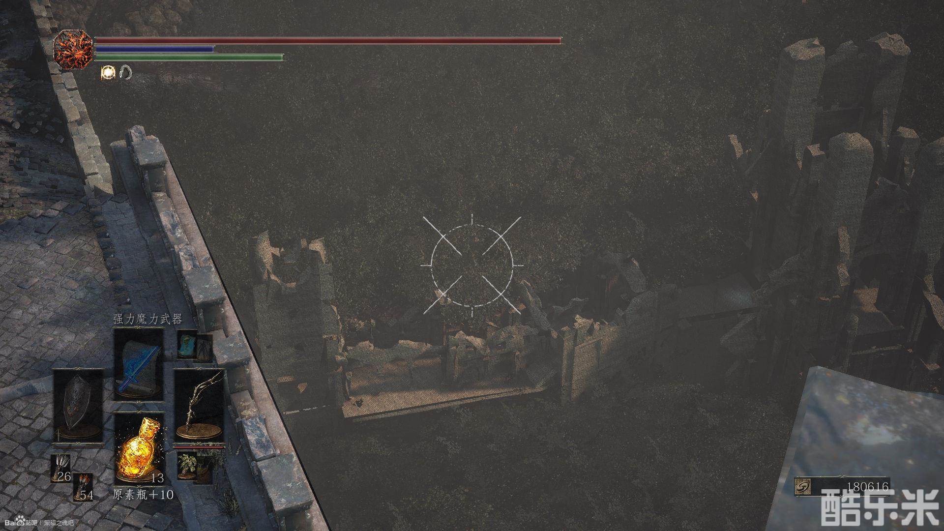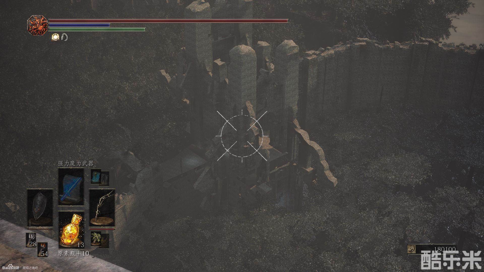 如图,当我们来到“高举小环旗”的这里,我们几乎是正对不死聚落和大树那里。而幽邃教堂在我们右侧,根据我之前说的面对南方,右侧就是西。而且,看起来似乎幽邃教堂距离我们比不死聚落还更近一点。