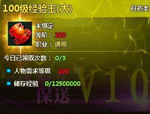 人物打怪、任务等级其它途径获得的经验将自动积累在经验玉内,储存满后可以领取里面的经验。每日最多可领取3次,所有类型的经验玉领取次数共享。