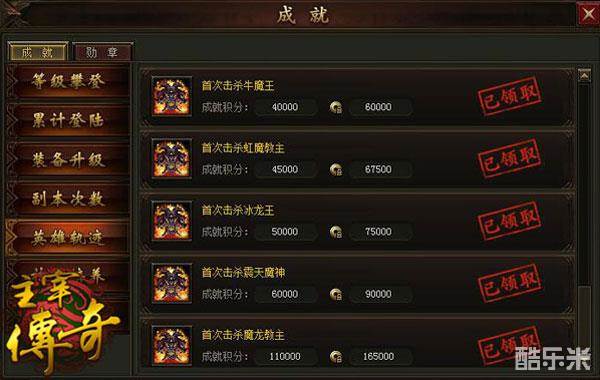 1、成就任务共有七种:等级攀登、累计登陆、装备升级、副本次数、英雄轨迹、神翼培养和降妖除魔。
