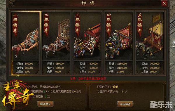 1、镖车分为5个品质,品质越高,奖励越多。玩家每日可以免费刷新3次镖车,之后每次刷新需要200绑元。