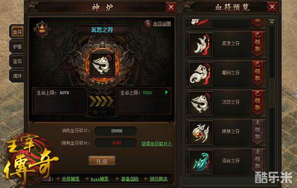 在神炉系统的四个分支中,血符是唯一一个不能被强化的装备,玩家们只能通过升级血符来提升生命上限!