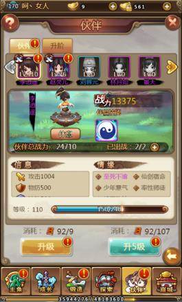 伙伴激活后,也可对其进行升级或升阶,等级越高、阶数越高均能提升伙伴的战斗能力。