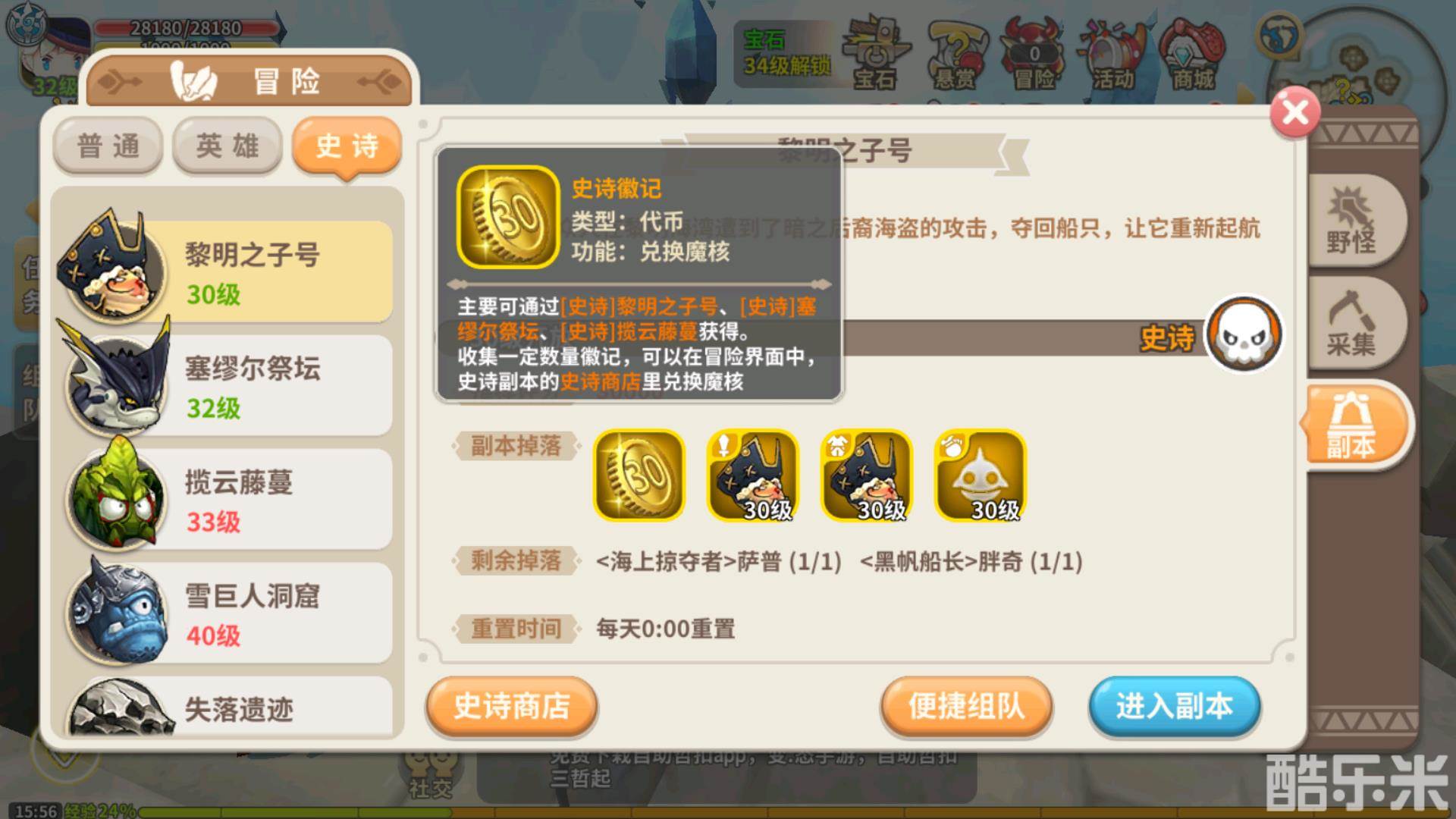 玩家可以通过收集这样的史诗徽记,当数量达到可以兑换的条件的时候可以自己在史诗副本界面的下方的英雄商店中选择自己想要兑换的特定部位史诗魔核来兑换。