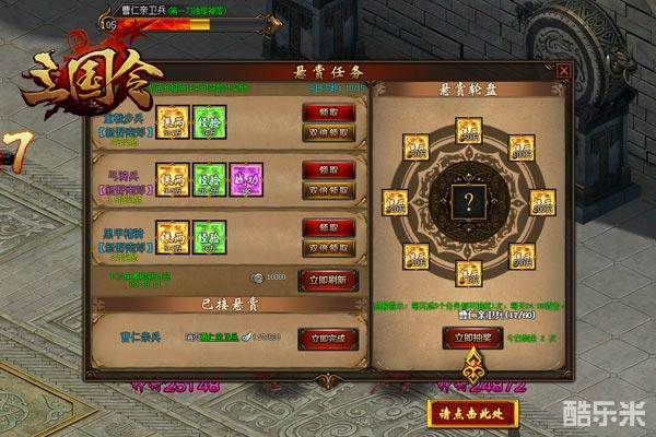 每位玩家每日均有15次完成悬赏任务的机会,根据任务品质,玩家将可以获得不同数额的银两奖励,并且玩家每完成5次悬赏任务,将可以获得一次抽奖的机会,随机获得5万-500万不等的银两奖励。