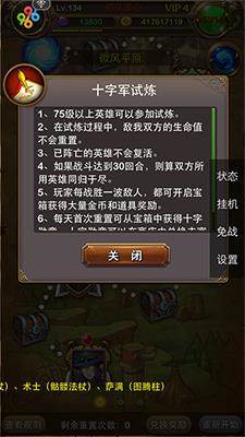 十字军的试炼每日都可以随时进去,每天充值一次。VIP等级达到6级以上的话可以额外在多一次重置机会,具体的官方玩法规则如下,大家可以自己进去看。