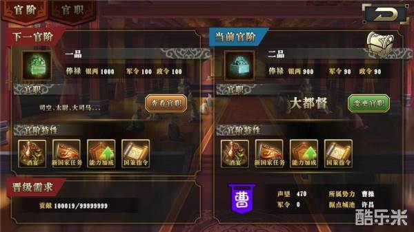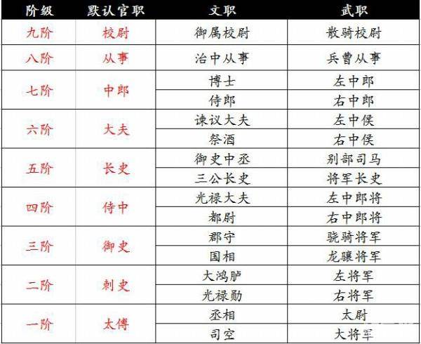 游戏里每个阵营都有一套官员系统,按照官衔高低分为九个品阶。