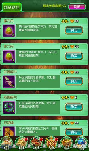 一、精彩商店可以额外获得玩家想要的道具,这里产出装备碎片,技能碎片,经验丹,体力丹,稀有神将以及扫荡炸弹等物品。