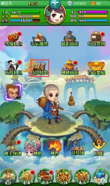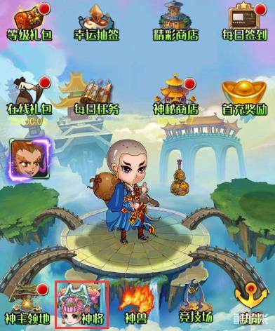 (说明:中间区域分为上半部分和下半部分,上半部分分别是八个功能,有等级礼包,幸运抽签,精彩商店,每日签到,在线礼包,每日任务,神秘商店,充值奖励。下半部分则为神主领地,神将,神兽,竞技场,功能,每个功能上面都会有智能锚点功能。)