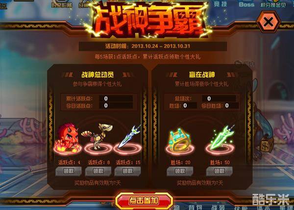 每天参加5场争霸赛可获得1点“活跃点”,每天最多可以获得3点活跃点。使用活跃点可以领取限时个性道具(个性萌宠,装备道具)同时累计胜场更可获得高属性武器!