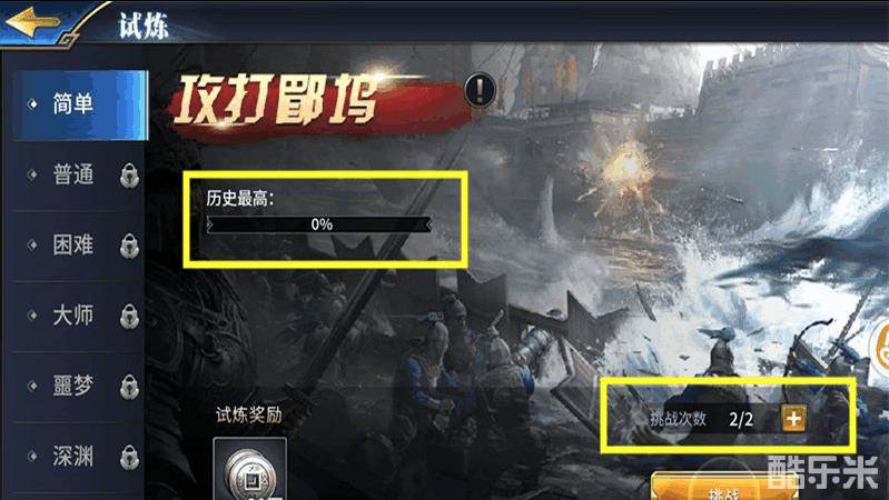 每次挑战系统会统计伤害百分比,等到历史最高百分比变为100%,可开启下个难度的关卡