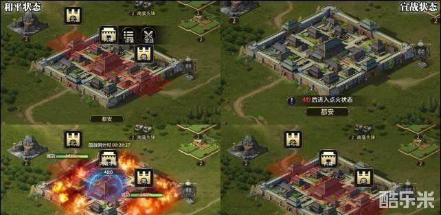 点火状态:宣战状态倒计时结束后,城池会进入持续30分钟的点火状态,在此状态下,对城池宣战过的军团里的所有主公均可持续发兵攻打城池,城池所属阵营的主公均可持续发兵驻防目标城池的城门和内城。