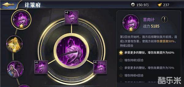 首先介绍战斗型计策,我们就以苦肉计和金蝉脱壳为例,前者属于提升伤害的计策,后者属于辅助类的计策,那我们应该如何使用呢?