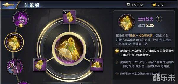 金蝉脱壳:每场战斗可抵抗一次致死伤害,该部队立即获得相当于本次伤害15%的护盾。
