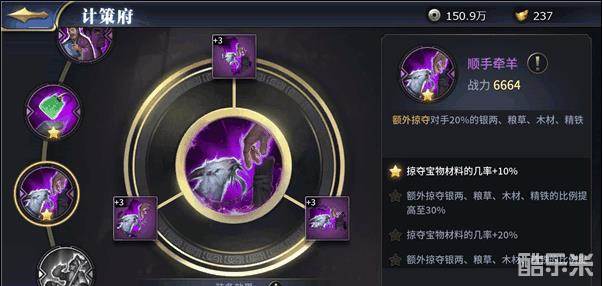 再来说说顺手牵羊:额外掠夺对方20%的银两、粮草、木材、精铁