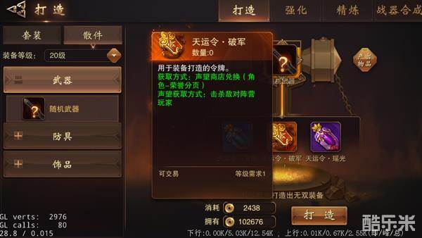 武器提供的攻击力最多,优先要打造武器,战力会飞跃