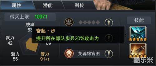 张松的两个技能对应了其步兵将的定位。第一个技能“奋起·步”,能提升所在部队步兵20%的攻击力。攻击提升率较大,但只是对于部队的加成了。第二个技能“无双·步”能提升所在军团步兵10%的攻击力。提升率和张飞一致,是一个比较强力的技能。既有部队技能也有军团技能,张松算是一个非常实用的步兵橙将了。