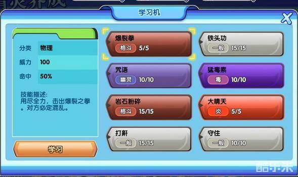 学习机也分为三六九等——绿色<蓝色<紫色<橙色<红色,越高级的学习机能够习得的技能就越厉害~训练家获得学习机的碎片到达一定的数量后,便可以合成相应的学习机哦~赶紧获得珍贵的学习机,给自己的精灵搭配强大的技能吧!