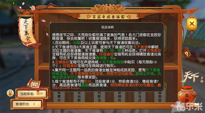 感恩节美食狂欢趴,《天下》手游喊你来“天下美食”收集天下食谱!顶、特、尊三种品质的天下食谱,打开玉馔食珍宝箱和玲珑食珍宝想即可随机获得,而且听闻食谱集·极就收藏在玲珑食珍里哦,收集癖们快快行动起来!当然,大荒不会白白辛苦各位少侠的,收集食谱即可解锁六大美食主题,当少侠集齐同一主题同一品质的食谱,不仅可以达成神秘成就,还能获得天下美食时装、天下美食聊天框和新陆尘外观等丰厚奖励哟!