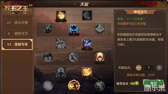策略专家天赋加点中,主要提升自身的治疗效果,辅助队友。同时提升命中率与暴抗等。