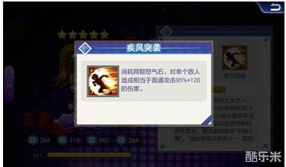 怒气技能 疾风突袭:消耗两颗怒气石,对单个敌人造成相当于普通攻击95%+120的伤害