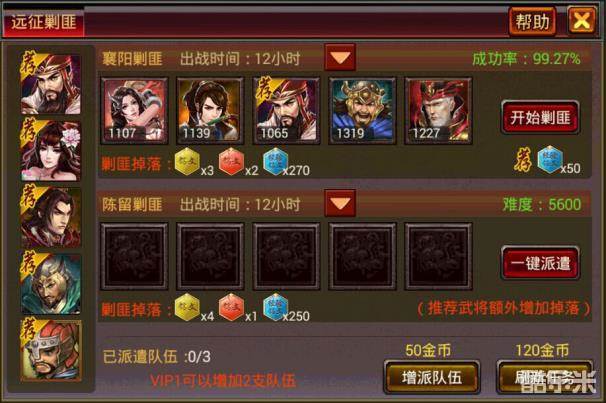 每位玩家默认最多可以派遣三支队伍执行剿匪任务,同时可以花费金币额外赠加1支队伍数量上限;V1可增派2支队伍;V6可增派3支队伍。