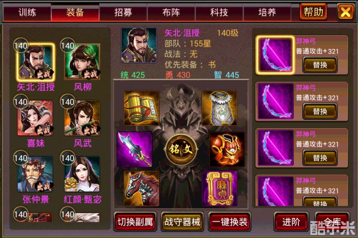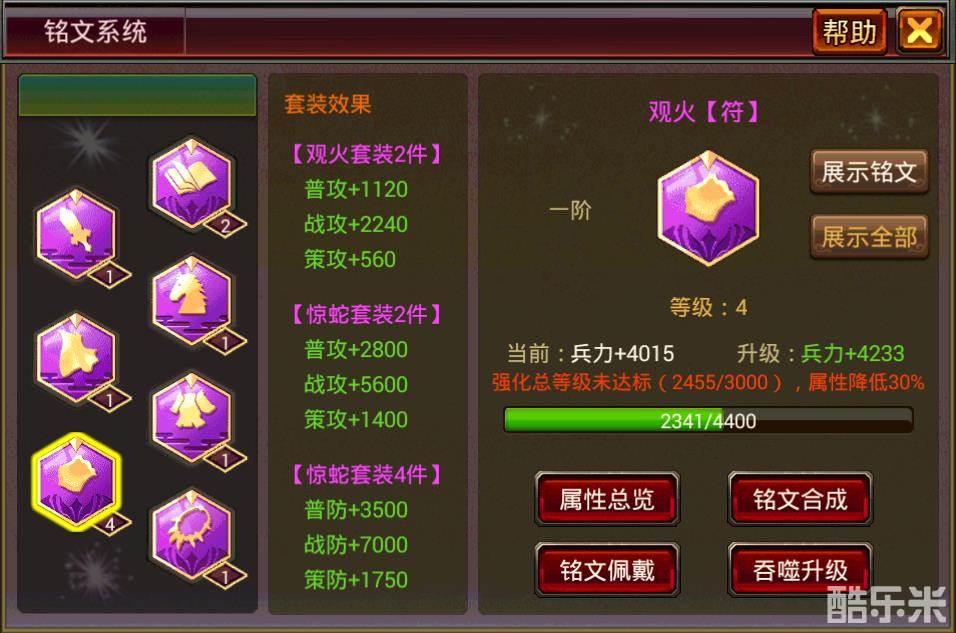 铭文系统的属性加成受武将装备系统的制约,主要武将的装备品质及强化等级越高,在铭文系统中受到的制约也就越少,详见铭文系统帮助说明。