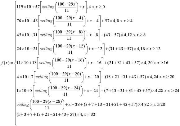 假设拥有x个三星相同武将(这里以升星小六为例),我们需要的三星小六个数最多也就是32个,因为即使每一脉都全部使用三星小六,那么 ceiling(100/29)=4,这里的ceiling是天花板函数,简单来说就是向上取整,例如,ceiling(5.2)=6,ceiling(7.4)=8等,那么,总共8脉,我们最多需要8*4=32个三星小六,下面,我们采用分段函数将计算公式列出: