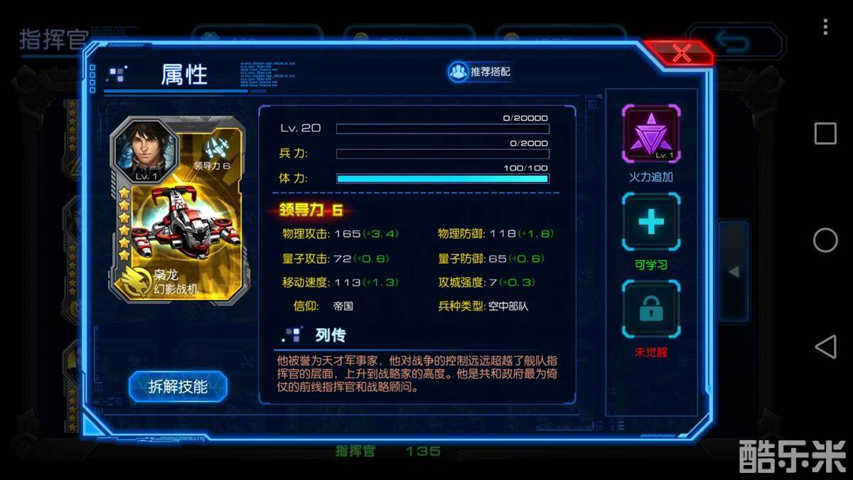 枭龙是帝国信仰下6星领导力6的空中部队高能将领,已经超越了普通舰队指挥官层面,一步越级成为真正的战斗战略家高度。他是联邦政府最为倚仗的前线指挥官和战略顾问。这也是新手期最容易获得的高星战将。从攻击方面讲,普通攻击后有50%概率对目标发动一次物理攻击,同时自身的普通攻击具有吸血效果。在防御方面也是有一定建树的,迂回战术战斗开始后前12秒,使敌方前两排发动物理攻击和量子攻击造成的伤害降低。进可攻退可守,能进能退才是人中佼佼者!