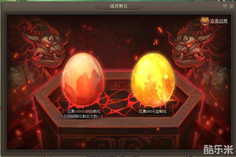 战兽孵化其实跟很多设置一样,分为铜钱和元宝两种,每隔24和72小时赤兽卵和金兽卵会分别提供一次免费的次数,每天铜钱的孵化次数为5次,下图的元宝孵化金额请大家不要看,这是测试用的,所以是开到了最高金额,初始还是50。